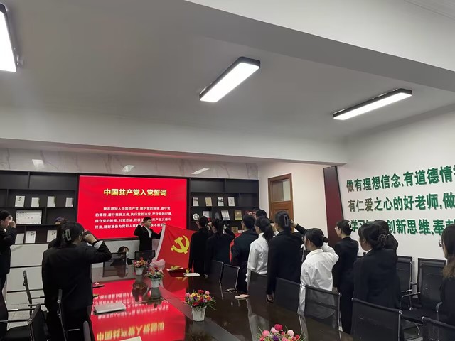 仪式在雄壮肃穆的《国际歌》中拉开帷幕。李宝坤同志宣读预备党员名单,并带领全体预备党员面向鲜红的党旗,高举右臂,紧握右拳进行庄严宣誓。预备党员们用高昂、奋进的声音传递着党员的决心和担当,用坚定、无悔的眼神彰显着党员的忠诚与执着。随后,李宝坤对新党员提出要求,希望同志们不要辜负党组织的期望,发扬党的优良传统,在今后各自的岗位上更加努力的学习和工作,规范自身言行,充分发挥党员的先锋模范作用,无愧于共产党员的光荣称号。