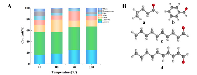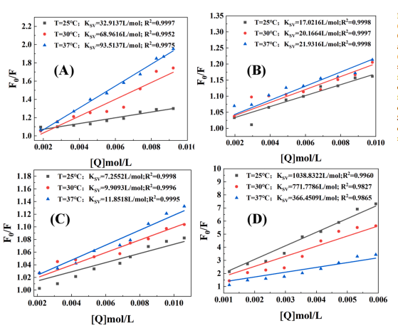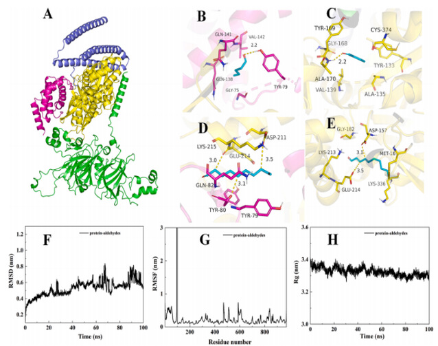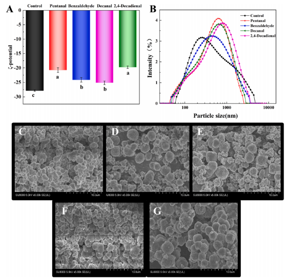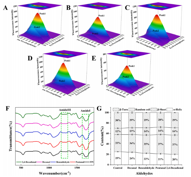 亚麻籽蛋白质与醛类的结合和释放行为对亚麻籽食品的感官特性具有重要意义。通过顶空固相微萃取-气相色谱-质谱法(HS-SPME-GC-MS)和气味活性值法(OAV)选择了亚麻籽的关键醛类,并通过多光谱、分子对接、分子动力学模拟和粒度技术研究了亚麻籽蛋白与亚麻籽蛋白之间的相互作用。结果显示,与戊醛、苯甲醛和癸醛相比,2,4-癸二烯醛与亚麻籽蛋白呈现出更高的结合能力和更高的Stern-Volmer常数。热力学分析显示,氢键和疏水相互作用是主要的力量。醛类促使亚麻籽蛋白的回旋半径(Rg)值和α-螺旋含量有一定的降低。此外,颗粒大小的结果显示,醛类物质导致蛋白质向大颗粒聚集。这项研究可以为亚麻籽食品和风味之间的相互作用提供新的见解。