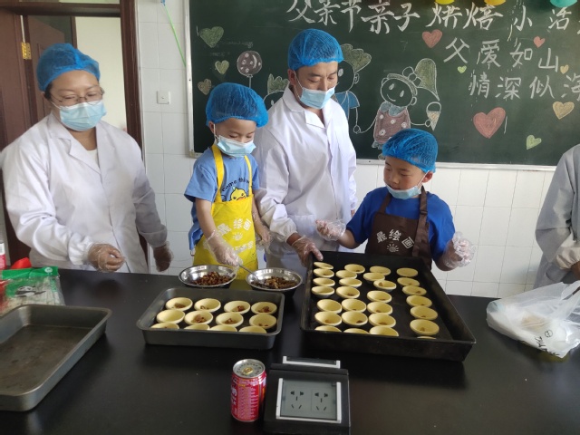 在等候蛋挞出炉的这期间,小朋友们也纷纷展示了自己的才艺,向一直默默奉献的父亲表达感恩之情。现场的氛围更加快乐轻松。欢快的歌舞声中,美味的蛋挞出炉了。在场小朋友及随行家长都认真品尝了自己的劳动成果。
