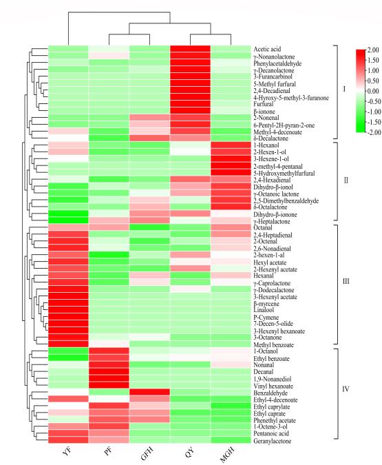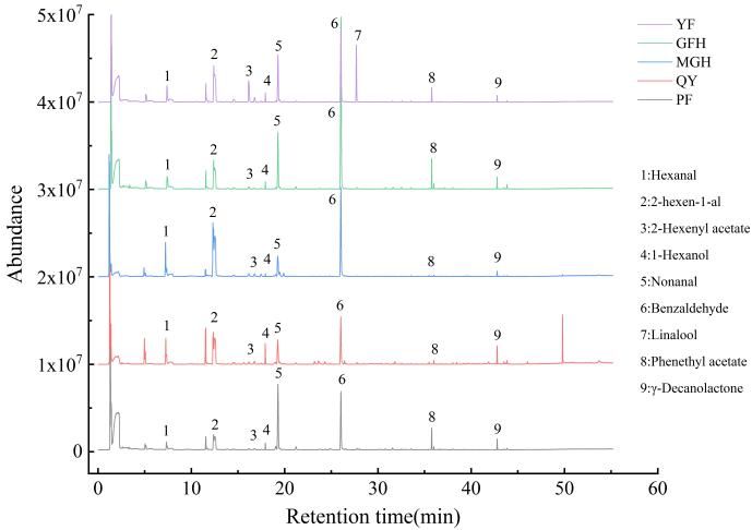 本文对新疆5个蟠桃品种的糖类、有机酸、酚类化合物、抗氧化活性和挥发性化合物进行了研究。蔗糖占总糖的70%以上,苹果酸、奎宁酸和琥珀酸占总有机酸的80%以上,对蟠桃的甜度和酸度有显著影响。绿原酸是主要的酚类化合物,对桃的抗氧化能力有显著贡献。此外,基于多元数据分析,识别了不同品种挥发性化合物的差异,并结合OAV分析鉴定了蟠桃的11种关键香气成分。这些香气成分可以作为特征标记,将蟠桃的香气与其他水果的香气区分开来。本研究通过多元数据分析了不同蟠桃品种的特征风味,为蟠桃特色风味食品的实际开发提供理论指导。也为通过香气重组技术和电子鼻分析进一步鉴定特征香气成分以及应用蟠桃的特征风味提供了理论依据。