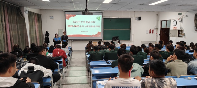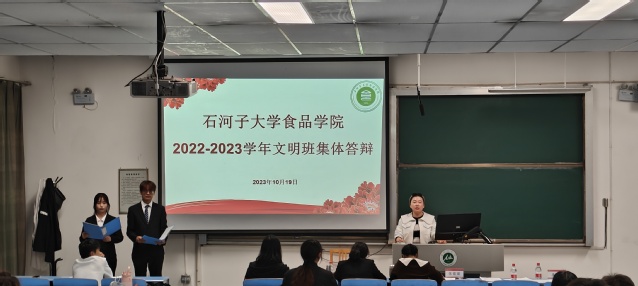 在学习方面,参赛班级通过汇报本班英语四六级通过率、计算机一级率、文明宿舍率,通过线上组建英语学习小组,线下小组讨论、帮扶,展现了良好的学习风貌和学风建设。在专业特色方面,参赛班级着力围绕专业、班级特色进行了汇报总结。如葡萄与葡萄酒工程专业班级通过专业组织班级中秋赏月品酒,在集体活动中,培养对本专业的热爱的同时,增强班级的凝聚力,提高专业技能,打造属于自己的班级特色。2021级食品质量与安全1班20多位同学登台答辩,随着记录“食安人”视频的播放,同学们一起唱出了属于自己,属于班级,属于每一位“食安人”的音乐,他们展现着yl23455永利集团学子的专业,热爱和自豪,更透露着他们对班集体的认同与奉献。评委老师对每一支参赛班级进行点评,既对各个答辩班级形式多样、富有教育意义的特色活动和取得的优秀成绩给予肯定和高度赞扬,又提出相关问题、改进措施和更高的要求。经过激烈的角逐竞争,14支参赛班级中选拔出4个院级“优秀文明班集体”,他们分别是:食品质量与安全2021级1班、食品科学与工程2021级1班、食品科学与工程类2022级6班、葡萄与葡萄酒工程2022级1班。