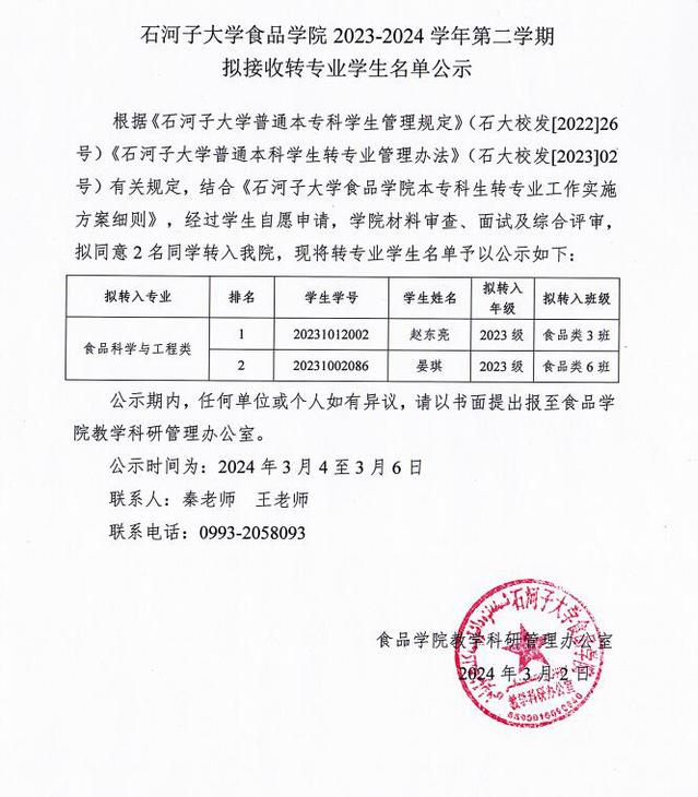 2023-2024学年第二学期拟接收转专业员工名单公示