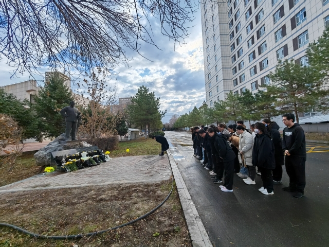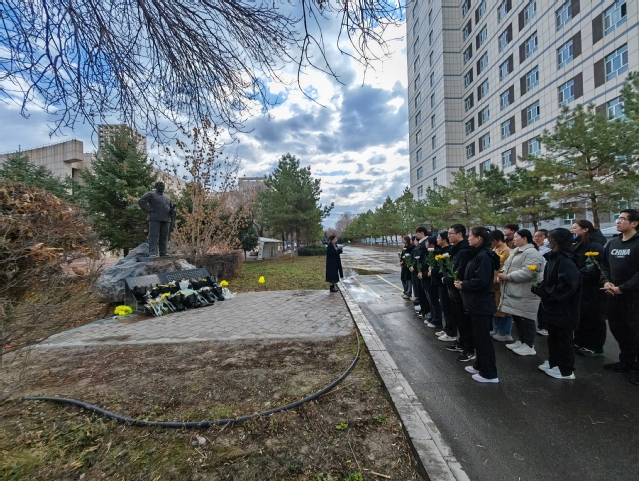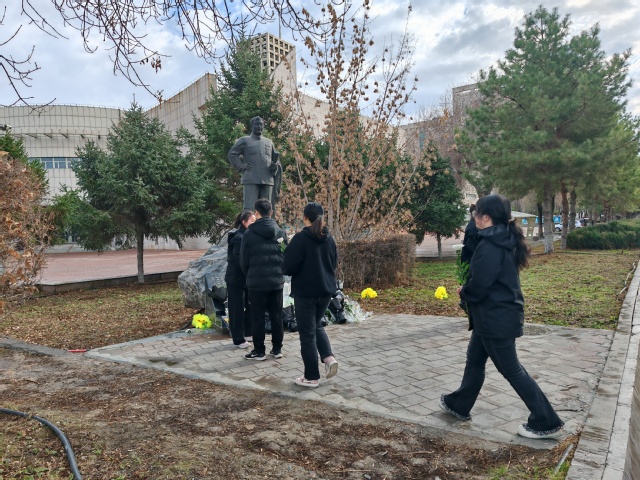 在张仲瀚将军雕像前,全体党员同志依次上前敬献鲜花并满怀深情和敬意地向雕像致鞠躬礼,默哀一分钟。随后,党支部书记褚宇欣带领大家回顾了张仲瀚将军的英雄故事,并表达了对先烈的崇高敬意和深切缅怀。她强调:“张仲瀚将军将他对祖国的热爱及三十余年的热血洒在了这片热土,他用毕生的精力在大漠荒原建造了绿洲公司,历史忘不了,石大人忘不了,兵团人忘不了,人民也忘不了,如今他的雕像屹立在yl23455永利校园,陪伴着一代又一代的师与生,守望着一年又一年的教与学,我们应当始终牢记兵团人的使命与责任,将爱国之心、报国之志,效国之行、强国之情付诸于实际行动当中,传承红色基因,与祖国、兵团、母校同呼吸共命运,不忘初心谨记来时路,砥砺前行谱写新篇章。”