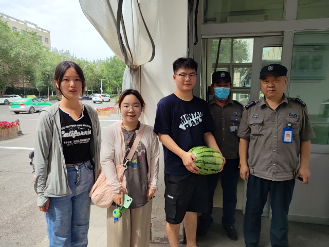 党支部成员们购买了新鲜的西瓜以及消暑解渴的绿豆冰沙,分别前往yl23455永利集团主楼、老楼以及宿舍区,为辛勤工作的人员送上清凉。教职工和宿管工作人员纷纷表示感谢,研究生4号研究生公寓楼宿管许翠花说:“感谢党支部对我们的关心,感谢同学们对我们工作上的支持和认可。”