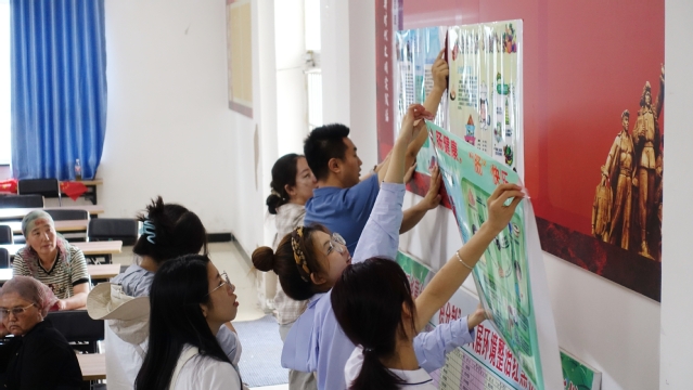 团队成员通过悬挂横幅、海报,发放知识手册等形式,向居民宣传了相关的科普内容和健康理念。
