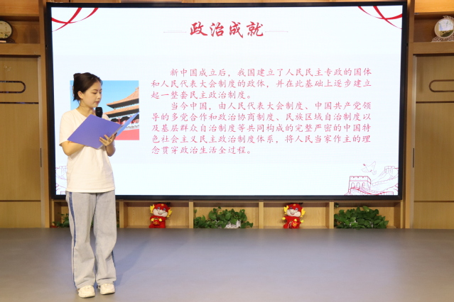 实践团成员通过演讲的形式,为大家分享了在兵团成立初期的一个故事。“由于条件艰苦,战士们夜盲症频发,一班战士心手相连,共同决定将他们的蔬菜分给一名战士。于是,他成为了众人的眼睛,以确保整个班夜间行动无忧”。随后,团队成员们分享了中国百年伟大时刻的视频。视频中中华人民共和国中央人民政府宣布成立的那一刻,两弹一星研发成功的那一刻,香港回归的那一刻……,让同学们在观看过程中深感自豪和骄傲。