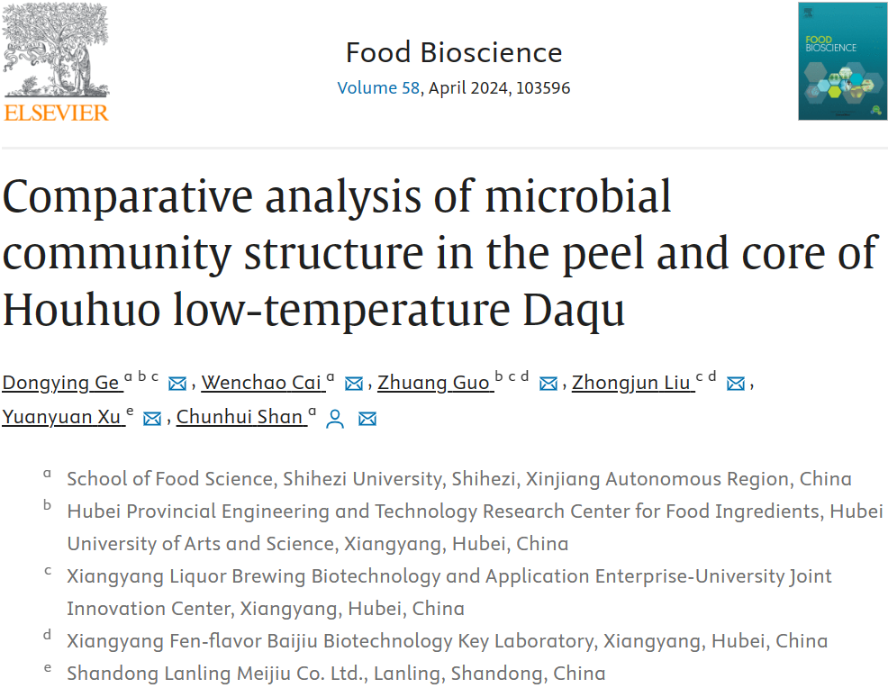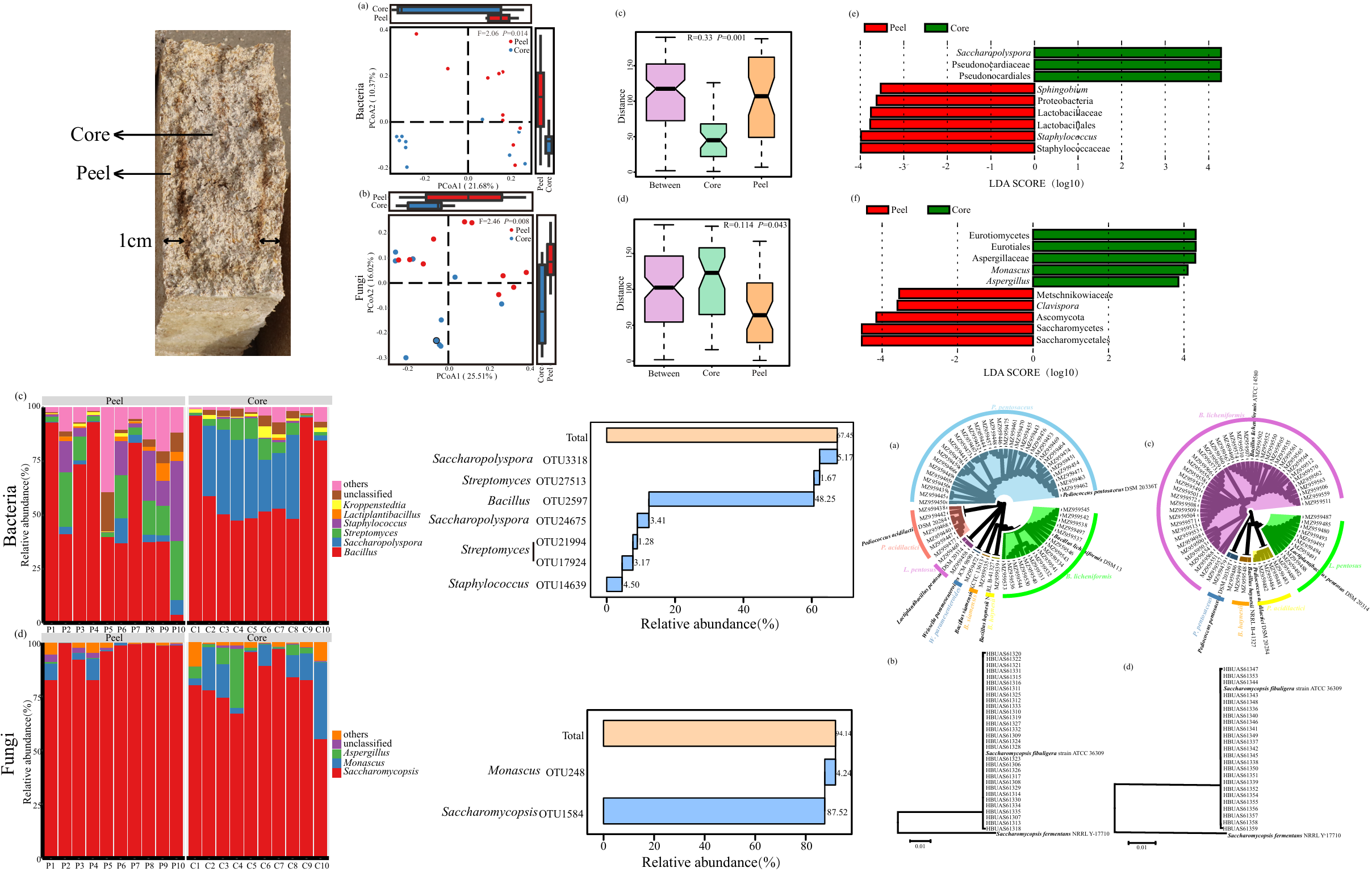 大曲为白酒的发酵提供了主要的微生物来源,并由微生物产生丰富的酶系和风味物质,对白酒品质的形成具有重要作用。低温大曲由固态发酵技术制备而成,根据生产过程中达到的峰值温度从高到低可分为后火曲(47-48℃)、红心曲(45-47℃)和青茬曲(44-46℃)三类。在发酵和后熟过程中,由于曲块内部不同部位温度和水分的变化存在差异,引起美拉德反应产生的褐变程度不同,使得后火低温大曲曲块横截面的外表面向内大约1厘米处出现了黑褐色的圆圈(封火圈),将大曲分成曲皮和曲心两部分。然而,目前解析后火低温大曲曲皮和曲心中微生物结构的研究相对较少。