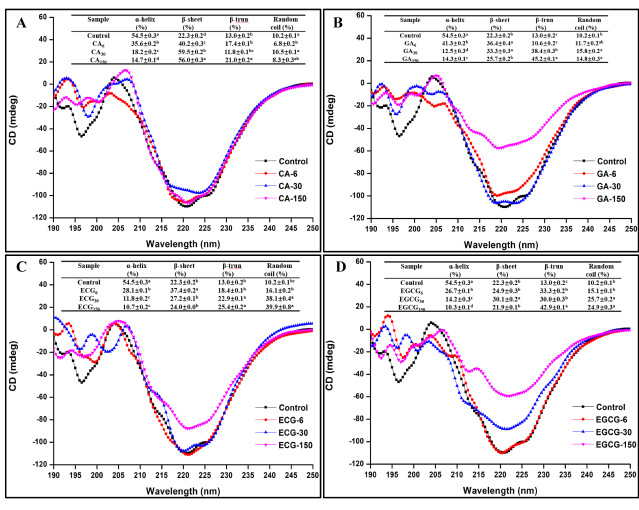 以高白鲑肌原纤维蛋白为研究对象,选取绿原酸(CA)、没食子酸(GA)、表儿茶素没食子酸酯(ECG)和表没食子儿茶素没食子酸酯(EGCG)4种多酚,分别与肌原纤维蛋白相互作用。根据不同多酚的种类和剂量,探究蛋白-多酚配合物的构象和凝胶性质的变化。同时,采用多光谱学和分子对接技术,探究蛋白-多酚相互作用的结合类型和具体作用位点。