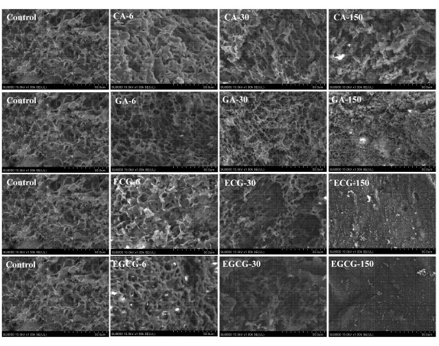 多酚以剂量依赖方式消耗蛋白巯基和游离氨基含量,以静态猝灭机制诱导蛋白发生荧光猝灭,并引起蛋白质的二级和三级结构变化。GA可以改善蛋白质的凝胶特性,而过量的ECG和EGCG会导致交联聚集并阻止凝胶网络的形成。热力学研究和分子对接证实CA、ECG和EGCG主要通过疏水相互作用与肌原纤维蛋白结合,而GA和肌原纤维蛋白主要通过氢键结合。多酚和蛋白质之间的亲和力顺序为EGCG > ECG > CA > GA。这些结果为改善高白鲑肌原纤维蛋白凝胶性质提供了另一种途径,也为后续研究高白鲑肌球蛋白与不同结构多酚的作用机制奠定基础。
