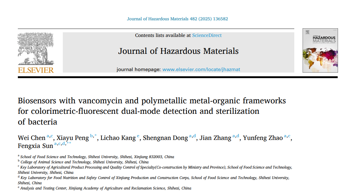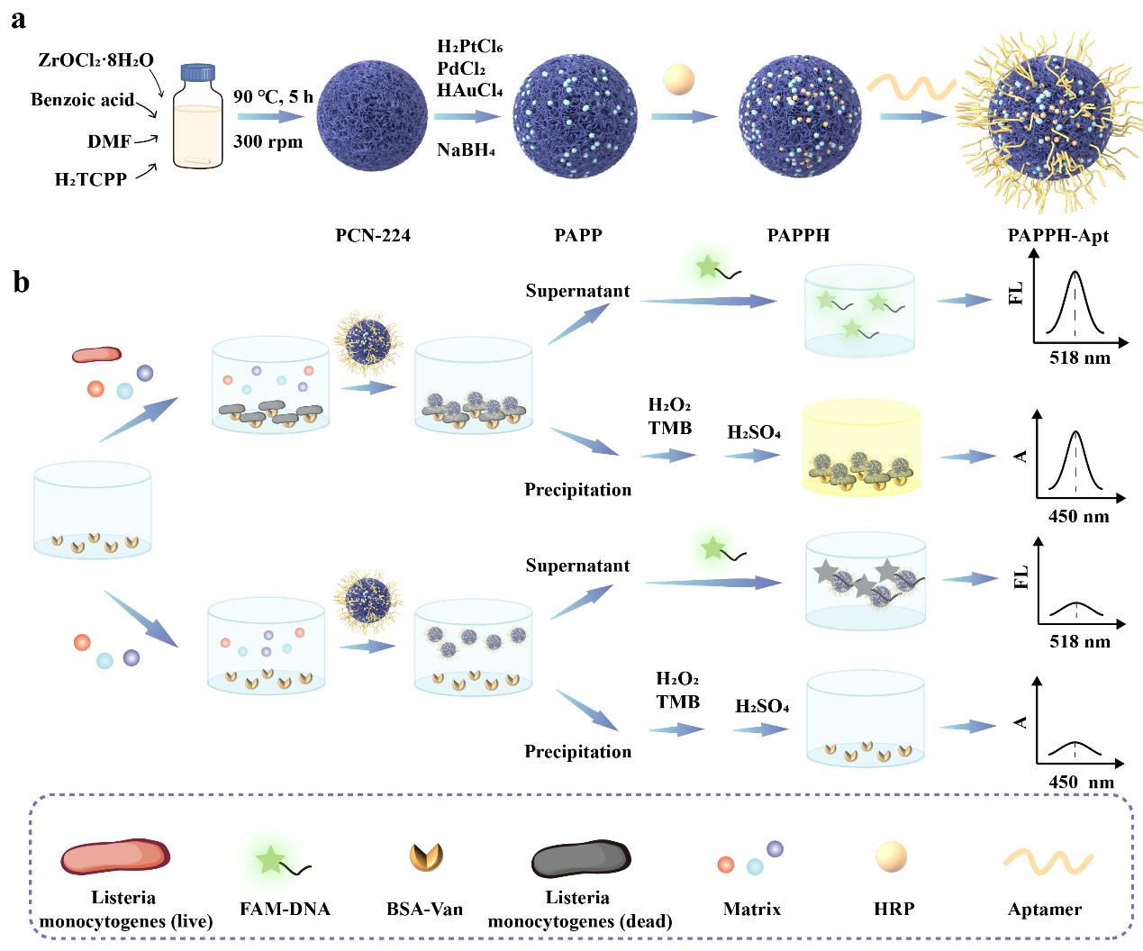 本研究利用万古霉素与适配体结合的多金属负载金属有机框架(PAPPH-Apt)对单核增生李斯特菌的双重识别,并通过PAPPH-Apt对荧光的猝灭过程以及对H2O2分解的催化过程,实现了杀菌和荧光-比色双信号检测的方法。该方法通过检测不同浓度单核增生李斯特菌导致的沉淀或上清液中PAPPH-Apt含量变化,进而通过荧光和颜色变化实现单核增生李斯特菌的定量分析。该方法实现了单核增生李斯特菌的高灵敏、双信号和细菌灭活。本文还将该方法应用于鸡肉、牛奶和池水的检测,显示出良好的应用前景。