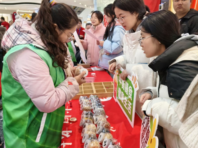 为增强活动的互动性与趣味性,志愿者们还开展了“谷物猜猜看”的小游戏。参与者通过观察谷物的外观、触摸谷物的质地,猜出谷物的名称,获胜者可获得精美小礼品。现场气氛十分活跃,大小朋友都积极参与其中,在游戏中学习到了丰富的谷物知识。食品青协“七彩红柳”社区服务队负责人李凯乐说:“我们于12月1号、5号两天在万达进行,第二天我们侧重于对社区居民谷物健康营养搭配的知识科普,本次活动共接待350余人,