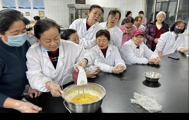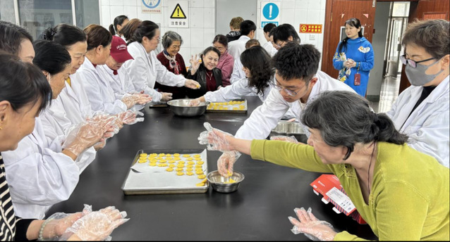 在实践环节,老同志们热情高涨,有的揉面塑形,有的搅拌蛋糊,实验室瞬间化身为“烘焙工坊”。经过两小时精心制作,金黄酥脆的牛奶饼干和松软绵密的戚风蛋糕陆续出炉。指导老师对作品逐一点评,并邀请大家现场品尝。参与者纷纷表示,活动既有趣又实用,不仅掌握了健康烘焙技巧,更体会到亲手制作美食的成就感。