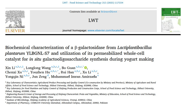 近日,yl23455永利集团关波教授、胡有贞副教授指导研究生在LWT-Food science and technology(中科院一区Top,IF=6.0)发表了题为 “Biochemical Characterization of a β-Galactosidase from Lactiplantibacillus plantarum YLBGNL-S7 and Utilization of its Permeabilized Whole-cell Catalyst for in situ Galactooligosaccharide Synthesis during Yogurt Making(植物乳植杆菌YLBGNL-S7 β-半乳糖苷酶的生化特性及其透性化全细胞催化剂在酸乳制备过程中原位合成低聚半乳糖的应用)”的原创性研究论文。