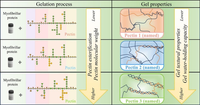 肌原纤维蛋白(MP)是肌肉组织的主要成分,可形成热诱导凝胶,从而决定加工肉制品的质地和质量。虽然纤维素和菊粉等多糖通常用作凝胶增强剂,但果胶由于其出色的生物相容性和对蛋白质的强亲和力而受到广泛关注。果胶与 MP 的相互作用潜力受其结构属性(包括 MwDE 和分支)的强烈影响。