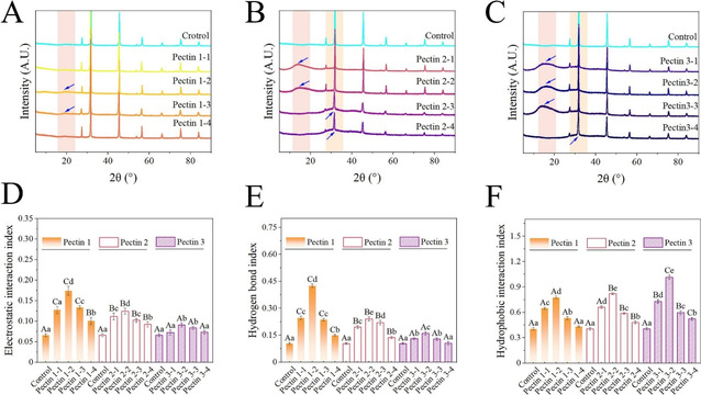 我们假设果胶之间的结构差异(包括MwDE 和支化)显著影响它们与MP 的相互作用并调节凝胶化特性。高分子量果胶有望通过提供更大的分子网络来增强物理交联,而高DE果胶尽管静电结合减少,但仍可能促进疏水相互作用。鉴于疏水相互作用对于 MP 热诱导凝胶化至关重要,高DE果胶可以稳定凝胶基质。此外,预计高度支化的果胶将通过增加分子缠结来提高凝胶稳定性。这些组合的结构效应可能会协同或拮抗地影响MP凝胶化,最终塑造凝胶质地和稳定性。