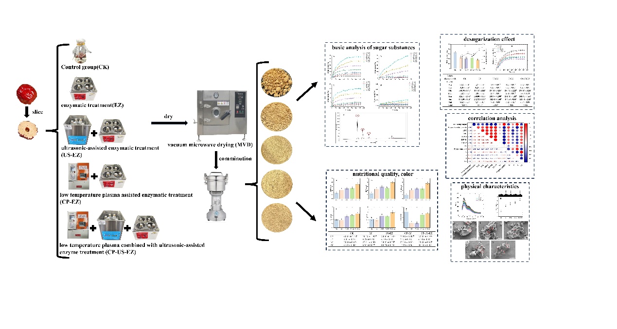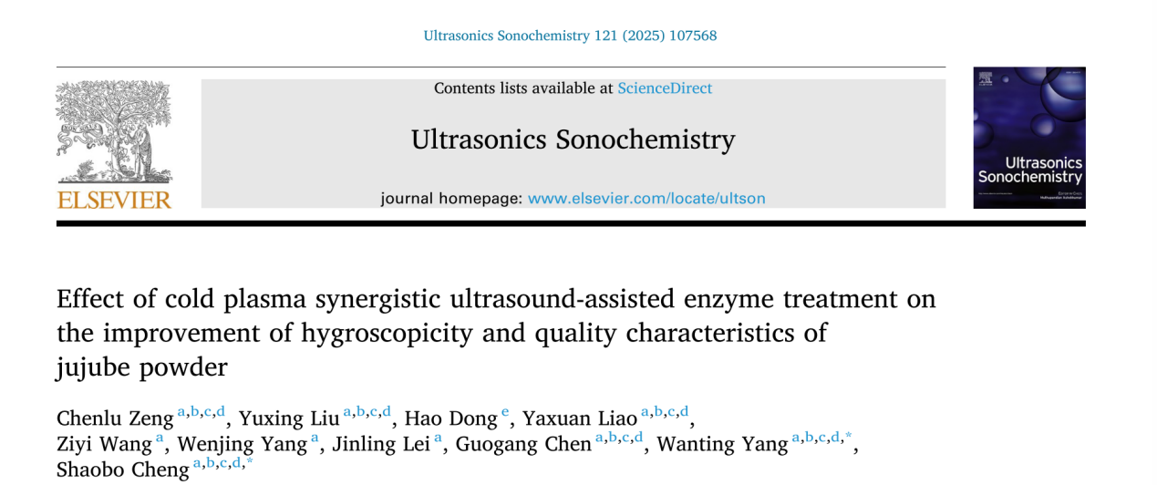 近日,果蔬贮藏保鲜技术研究中心陈国刚教授团队在化学领域TOP期刊《Ultrasonics Sonochemistry》(中科院1区TOP,IF=9.7)发表了题为“Effect of cold plasma synergistic ultrasound-assisted enzyme treatment on the improvement of hygroscopicity and quality characteristics of jujube powder”的原创性研究论文。
