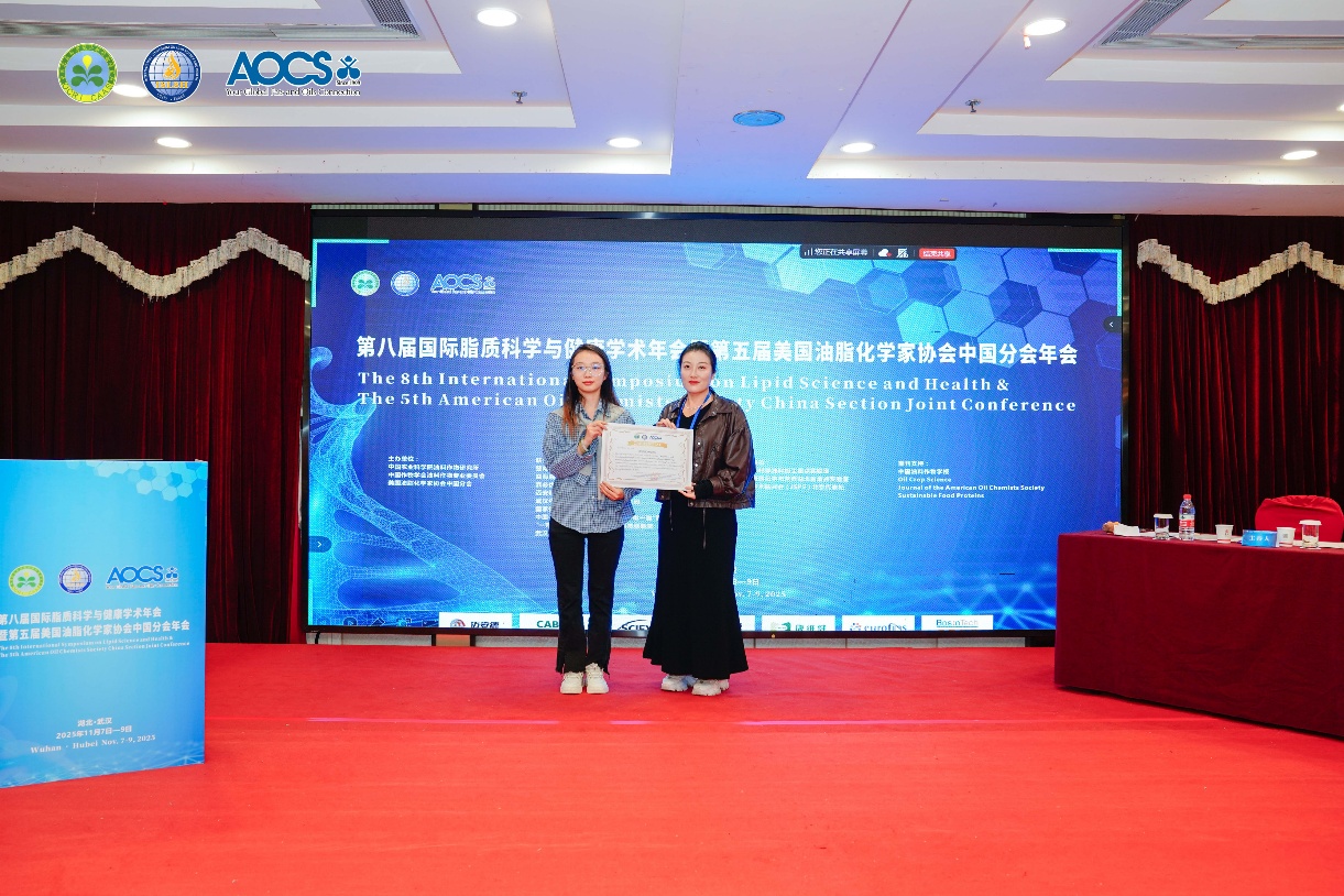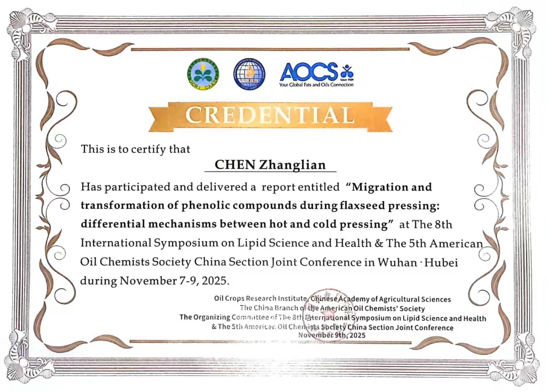 2025年11月7日至9日在湖北武汉召开“第八届国际脂质科学与健康学术年会暨第五届美国油脂化学家协会中国分会年会”,此次会议由中国农科院油料作物研究所联合美国油脂化学家协会中国分会等单位联合主办。作为脂质科学领域极具影响力的国际学术交流平台,本次会议以“新质生产力赋能脂质 & 蛋白质产业可持续发展”为主题,汇聚了全球16个国家的知名专家学者、行业精英及青年科研人员,共同探讨脂质科学与健康领域的前沿进展与产业趋势。yl23455永利集团粮油技术研究中心硕士研究生陈章莲参会,并在研究生论坛作题为《亚麻籽压榨过程酚类化合物的迁移与转化:热榨与冷榨的差异机制》专题学术报告,系统分享了团队在亚麻籽加工过程中功能成分转化机制方面的最新研究成果,引发与会专家广泛关注。
