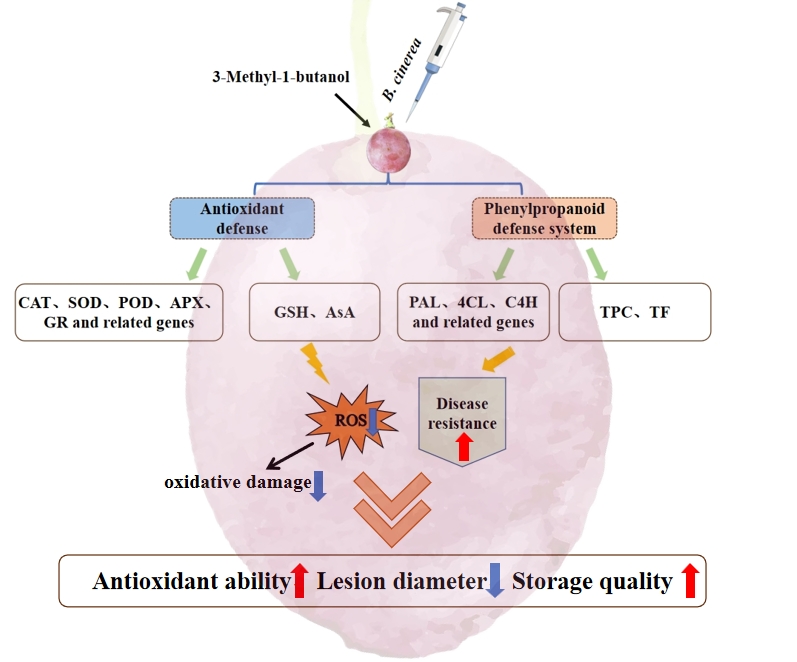 为此,该研究探索了3-甲基-1-丁醇对红提葡萄灰霉病抗性的调控机制。研究发现,经3-甲基-1-丁醇处理后,有效抑制了灰葡萄孢菌在红提果实表面病斑直径的发展,延缓了红提葡萄的品质劣变;进一步分析显示,3-甲基-1-丁醇处理增强了苯丙氨酸解胺酶(PAL)、肉桂酸-4-羟化酶(C4H)、4-香豆酸辅酶A连接酶(4CL)活力和基因表达水平并促进相关次生代谢物积累来激活苯丙烷代谢;此外,活性氧(ROS)代谢分析显示,3-甲基-1-丁醇处理减少了过氧化氢(H2O2)和超氧阴离子(O2-)的积累,这也刺激了与ROS清除相关的抗氧化酶活性和转录水平,以及谷胱甘肽-抗坏血酸循环协同改善氧化应激。总的来说,3-甲基-1-丁醇通过提高苯丙烷和ROS代谢维持了红提葡萄采后果实品质。该研究为采后葡萄果实中灰霉病的控制提供了一种安全有效的新型策略。