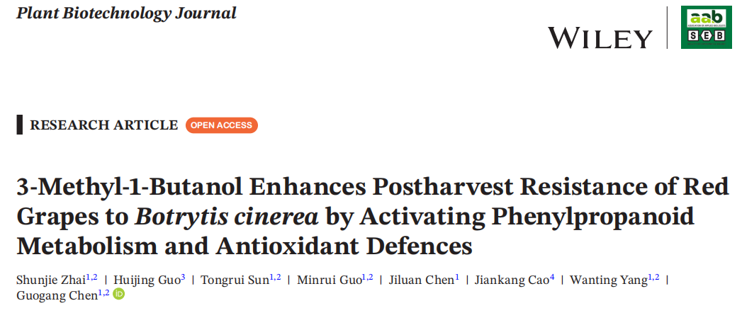 近日,公司果蔬贮藏保鲜技术研究中心陈国刚教授团队在葡萄采后病害防治及抗性机制研究方面取得重要研究进展,研究成果以“3-Methyl-1-butanol enhances postharvest resistance of red grapes to Botrytis cinerea by activating phenylpropanoid metabolism and antioxidant defenses”为题,发表于TOP期刊《Plant Biotechnology Journal》(中科院1区,IF=10.5)。