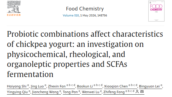 公司畜产品加工与质量安全控制中心发酵乳制品研究团队在益生菌组合对鹰嘴豆酸奶的物理化学性质、流变学特性、感官品质以及短链脂肪酸(SCFAs)发酵的方面取得重要研究进展,研究成果以“Probiotic combinations affect characteristics of chickpea yogurt: an investigation on physicochemical, rheological, and organoleptic properties and SCFAs fermentation”为题,发表于TOP期刊《Food Chemistry》(中科院1区,IF=9.8)。