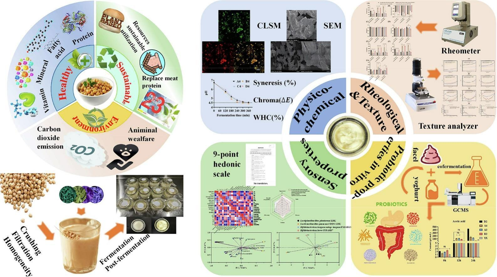 植物基酸奶已成为一种流行的无乳制品替代品,受到对乳制品过敏者的消费者的青睐。完全植物性的植物性酸奶(不含动物成分)在口味上与传统乳制品有所不同,其稳定性仍是一个问题。要实现植物性酸奶产品的典型质地(类似于乳制品酸奶),需要具备顺滑性、适当的粘度和硬度以及整体稳定性,这带来了重大的技术挑战。鹰嘴豆被认为是一种健康营养丰富的食品,具有优异的持水能力、乳化能力和凝胶形成能力以及起泡能力,因此开发出了多种鹰嘴豆发酵产品,如鹰嘴豆小麦面包、花生鹰嘴豆复合植物奶。然而,如何选择合适的益生菌组合进行发酵可以加快酸化速率、改善质地、提升风味并调整营养成分结构,促进肠道消化尚有待探究。